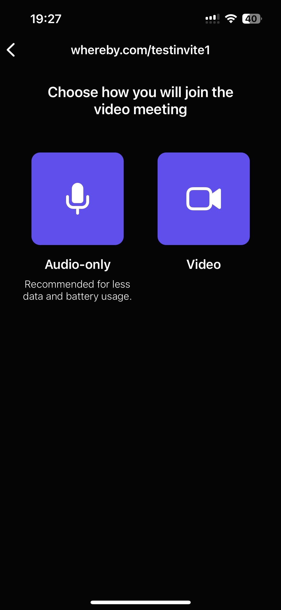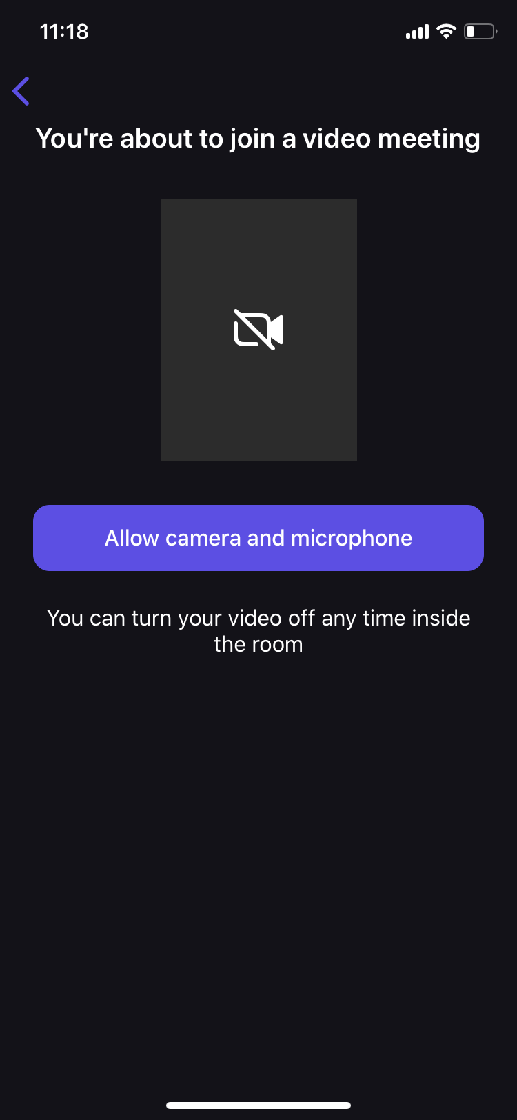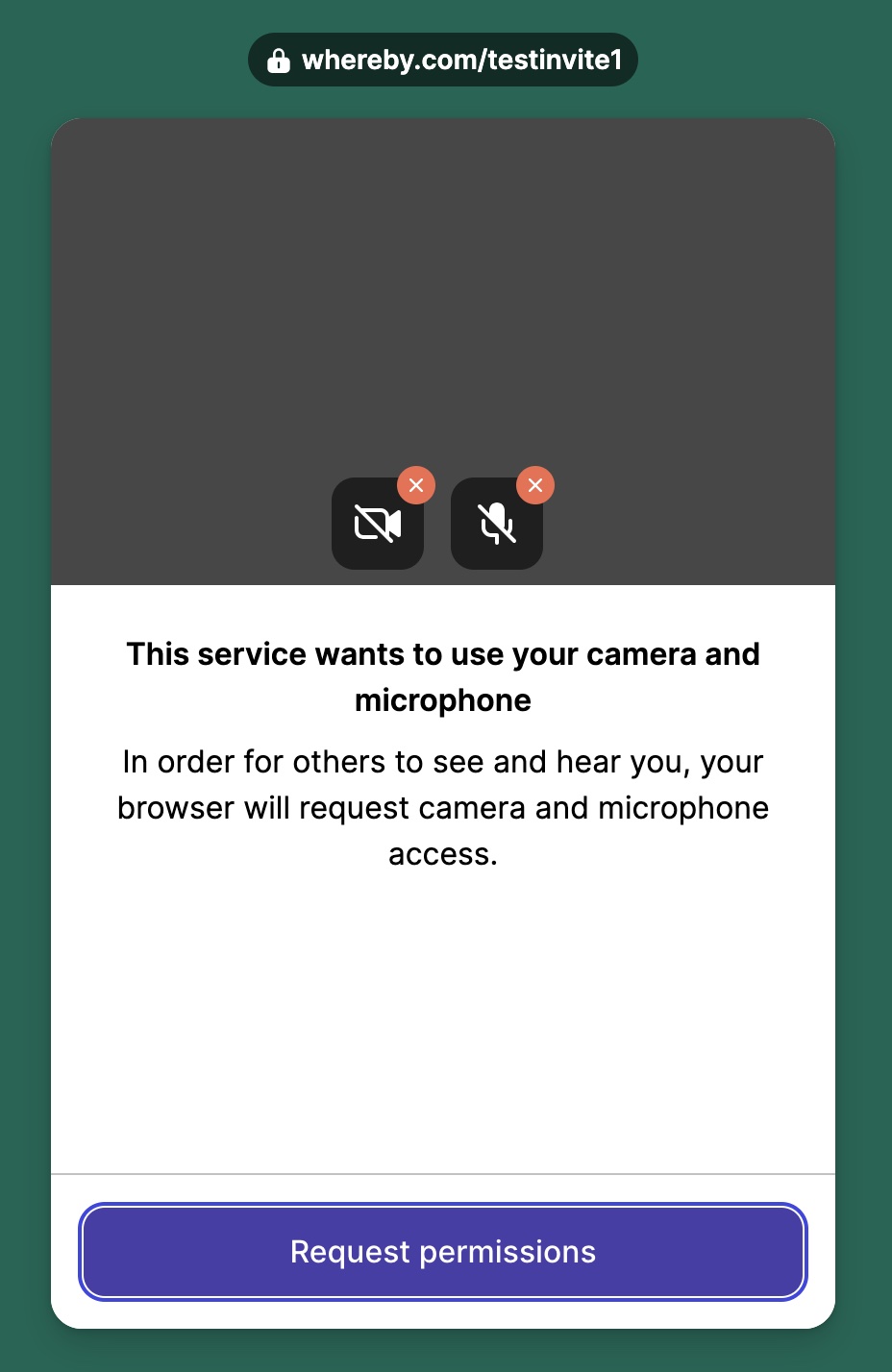 If it's your first time using Whereby, you will see a screen prompting you to allow mic and cam access. Tap on the Allow Camera and Microphone button and follow the system prompts: