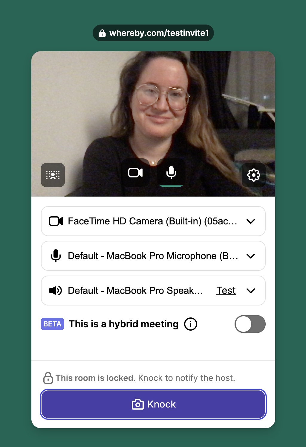 After allowing access, you'll see an image of yourself and, if you wish, you can disable your cam and/or mic. Once you are ready, you can click the Join meeting or Knock button to enter the meeting from here!