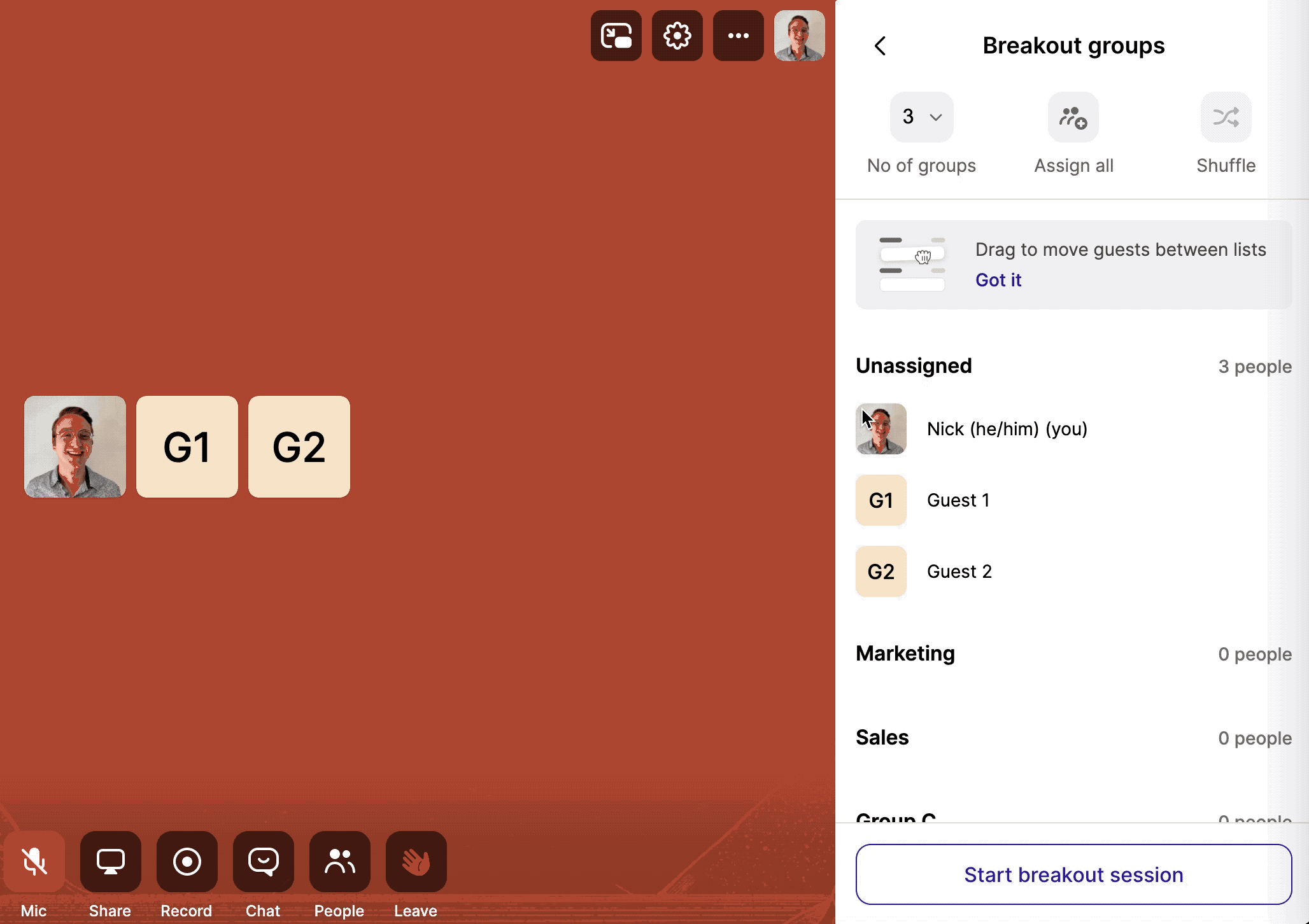 Drag and drop participants' names to assign them to a group.