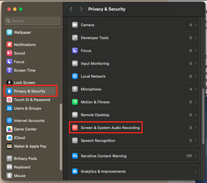 Scroll down to the Screen & System Audio Recording section, and ensure that your browser is toggled on.