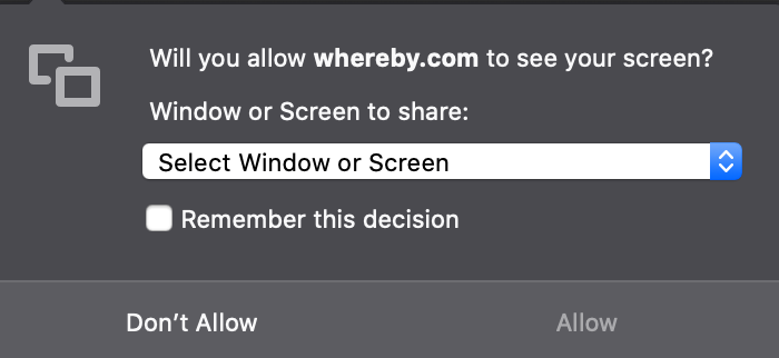 When you first use screen sharing in Firefox, you'll see a pop up that asks if you'd like to allow Whereby to access your screen: