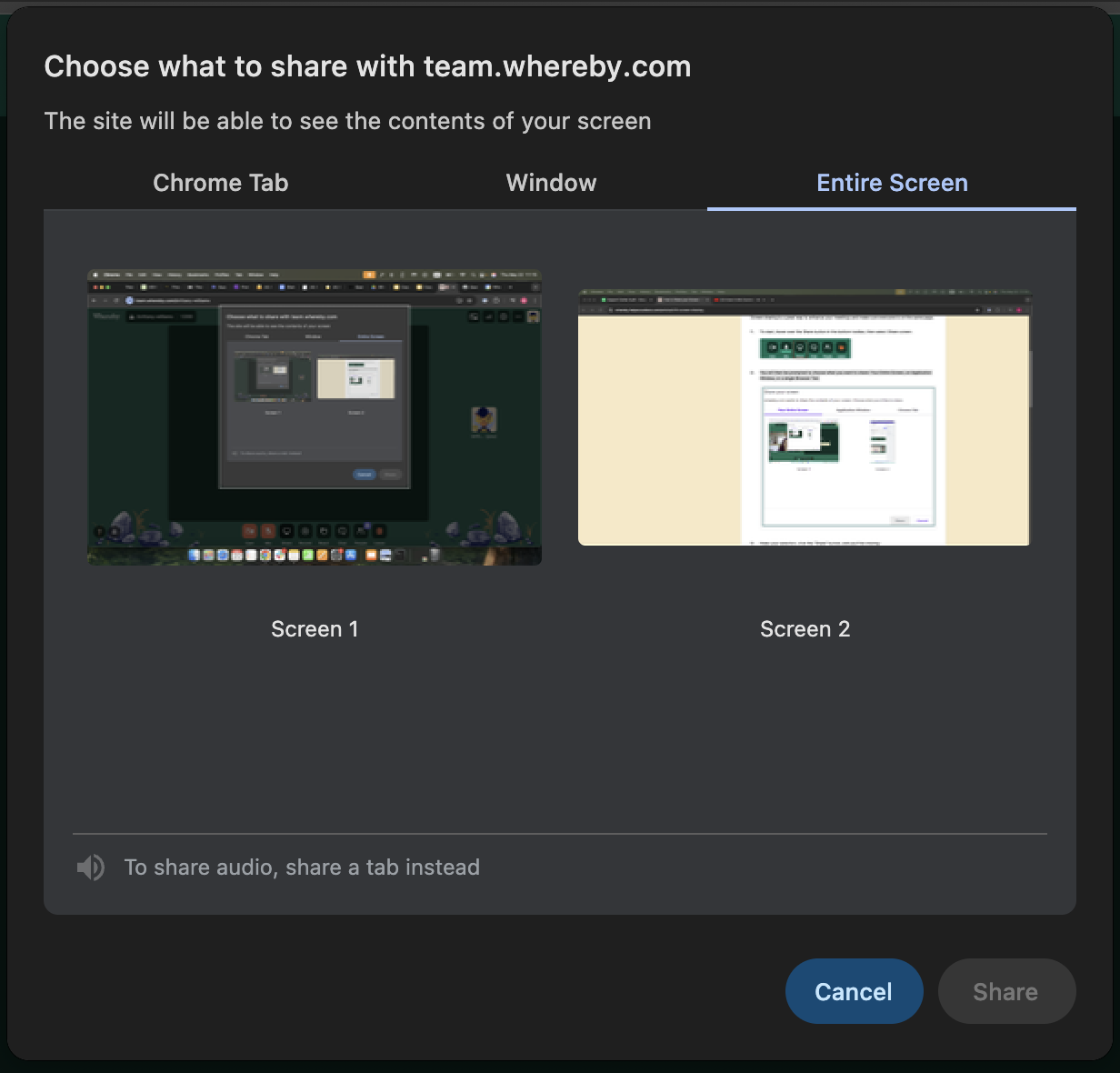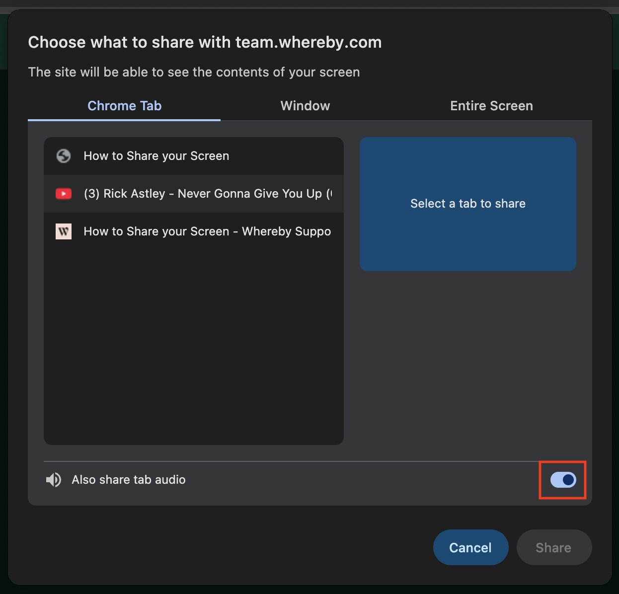Choose Browser Tab or Entire Screen, toggle on for share audio, and then click the "Share" button.
