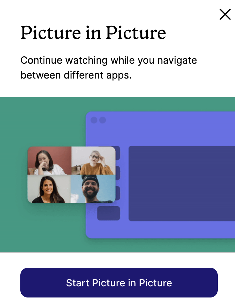 Many users want to have a way to see what's happening in the room while sharing another browser tab or application on their computer. Picture in Picture is a way to do this. With our Picture in Picture mode, you can now have a "pop-out" version of your room that will hover over the other windows on your machine. This way you can still see the video feeds of your guest, and keep your attention on what you're sharing!