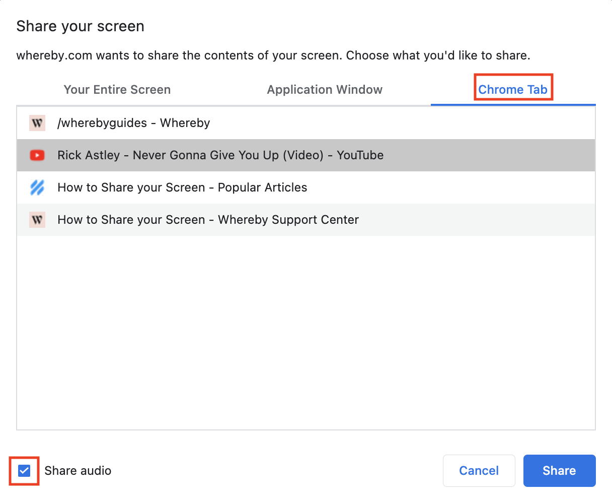 When Screen Sharing with audio on Windows, you're able to share the audio of your entire screen. Sharing the audio of your entire screen will also share the audio from your Whereby room, which can cause an echo effect. To prevent this issue from happening try sharing the audio of a Chrome tab instead.