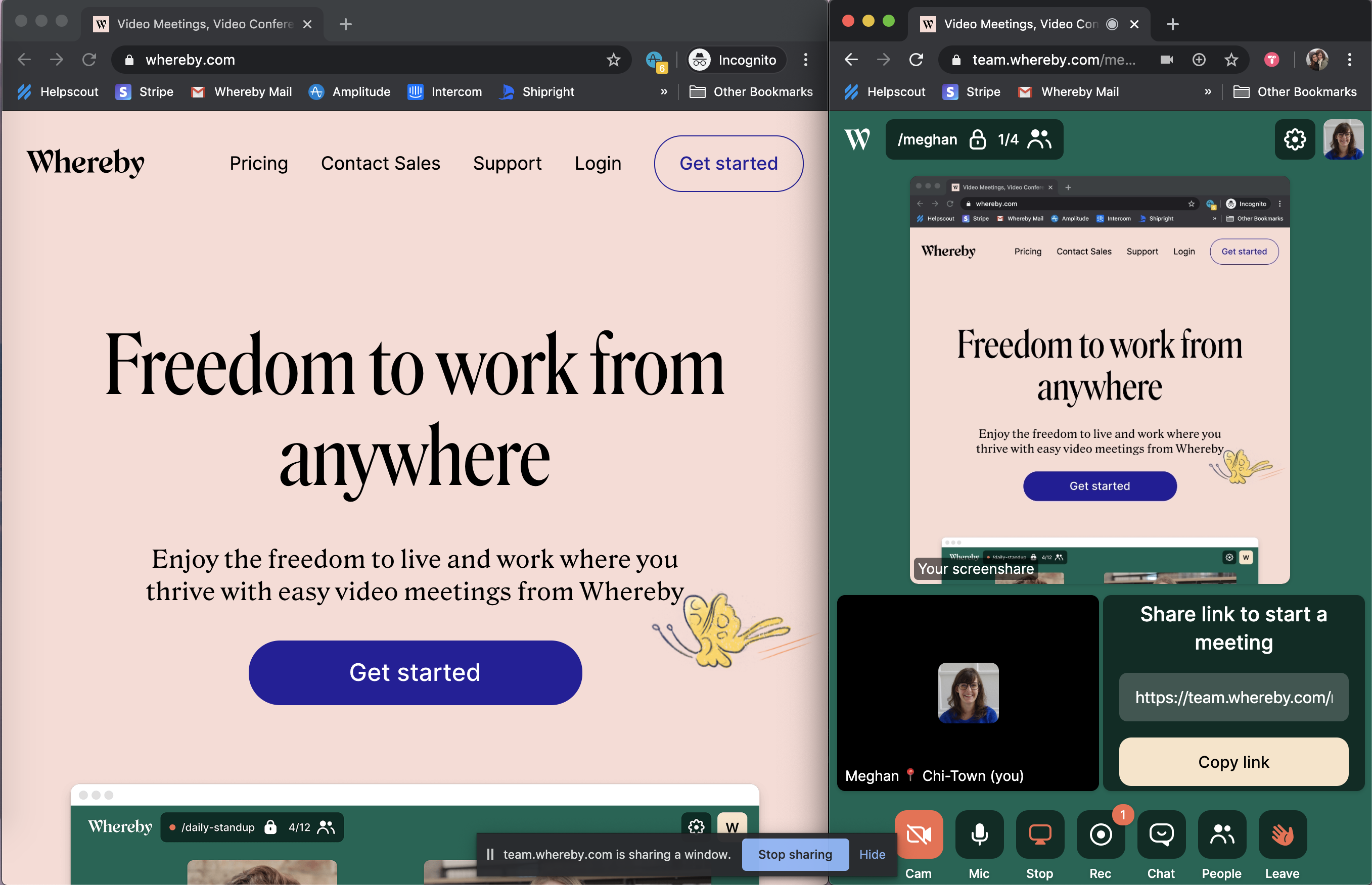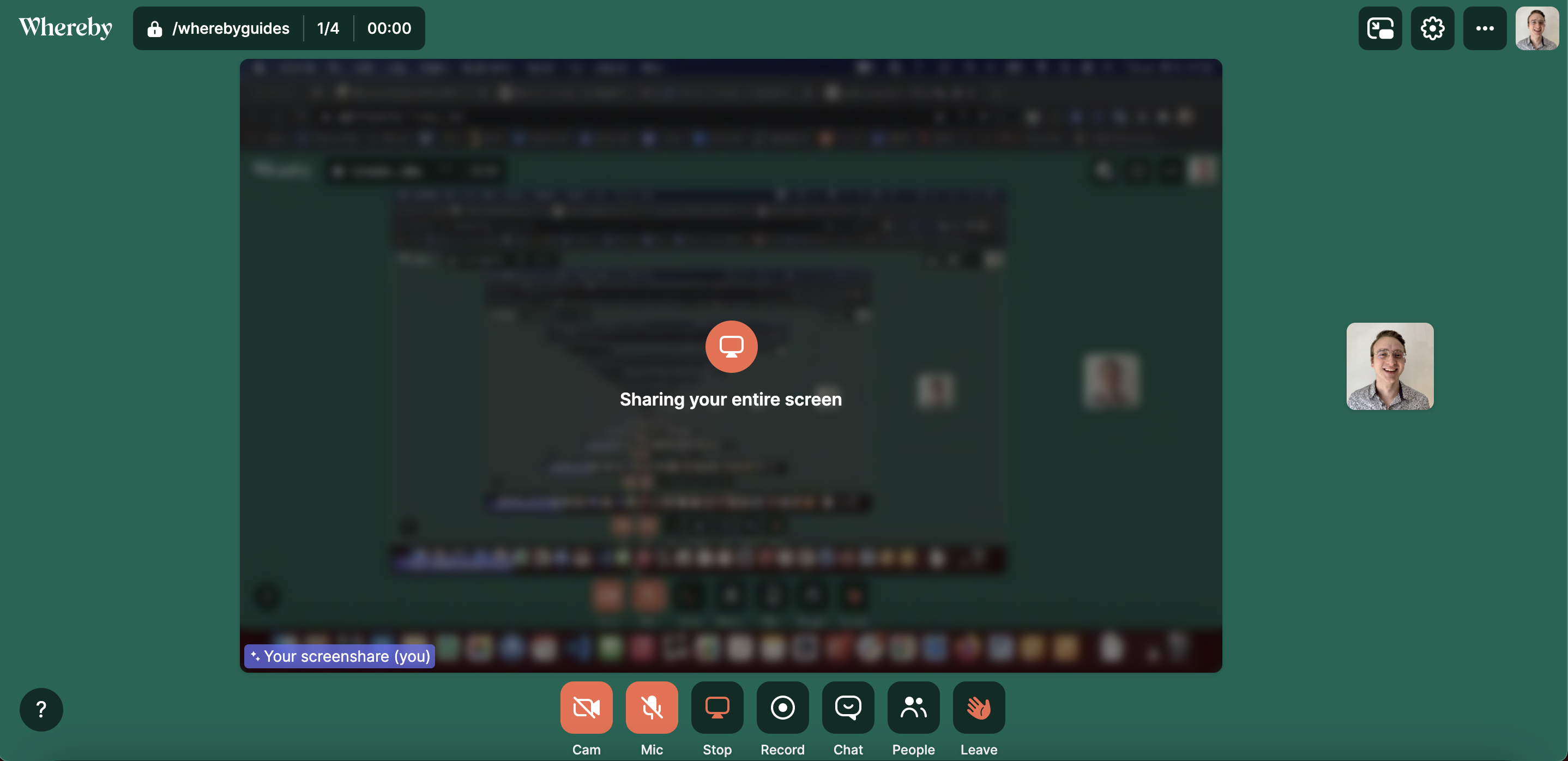 If you're on the go or don't have a secondary monitor, you can still keep a view of your room open while you screen share. The main caveat to this is that you won't be able to share the entire screen, as doing this would cause the infinity mirror effect. With this method, open Whereby in its own separate browser window, and make that a small portion of your screen. Then, you have your shared content taking up the bulk of your screen, and share that specific application window or tab.