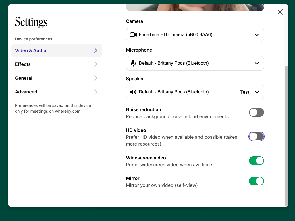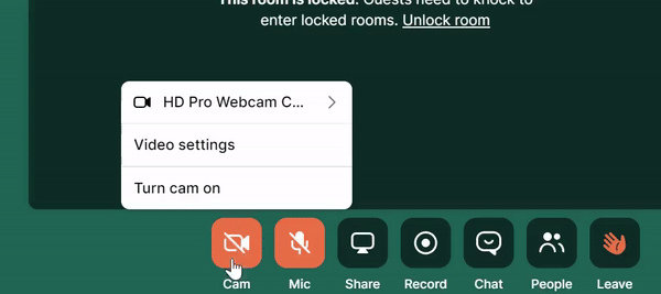 Within your Whereby room you're able to set a default camera and microphone. You can access these options either via the Meetings Settings option, or more quickly by hovering over the camera or microphone icon on the bottom toolbar and then selecting the device you want.