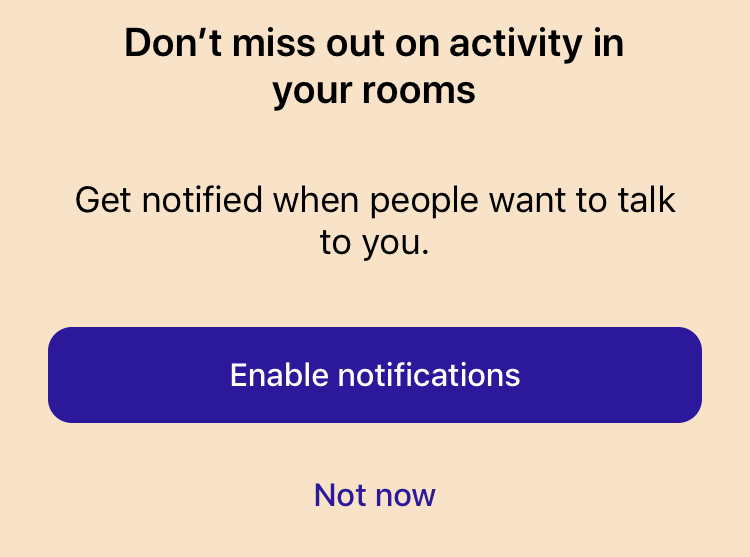 If you do not receive a prompt to allow notifications when you enter a room that you own, it may be that you have already dismissed or blocked notifications on your device. To check this, follow the steps below for your device type: