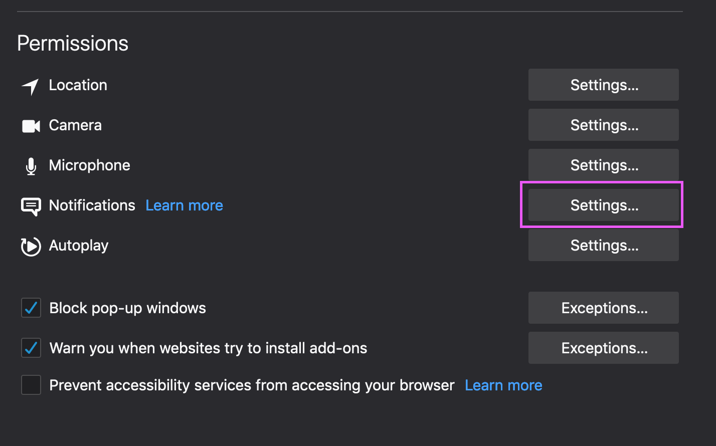 Scroll down to the Permissions section and click the Settings button next to Notifications.