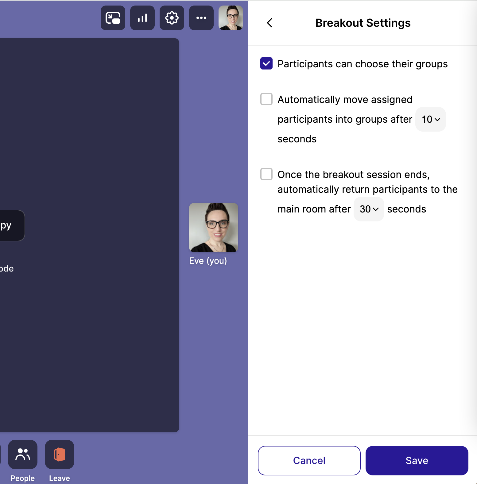 Participants can choose their groups: If checked, participants can join any group on their own once the breakout session starts. If unchecked, participants can only join the group they were assigned to, and unassigned participants won't be able to join any group.