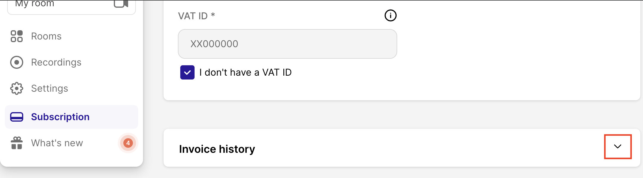 Click Subscription, scroll all the way down, and then click on the dropdown symbol under the Invoice history section: