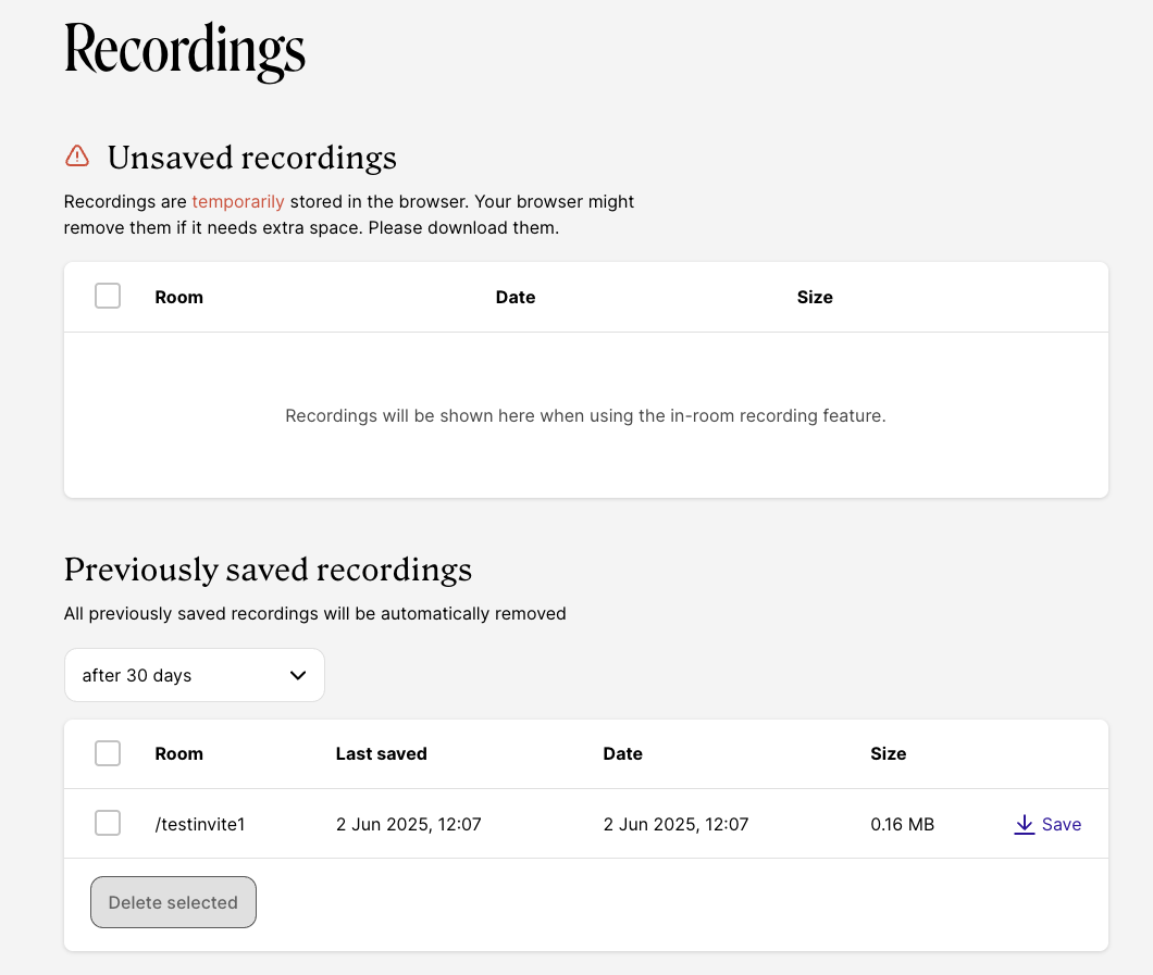 You can also hover over the recording button then click on Get Recordings to access your Recordings page. This will show your new and historical recordings, currently stored locally in your browser's cache. From here, you can download multiple or just one recording by pressing the "Save" button. The recording will be downloaded to your device. You can also select when you'd like previously saved recordings to be automatically removed from your Recordings page.