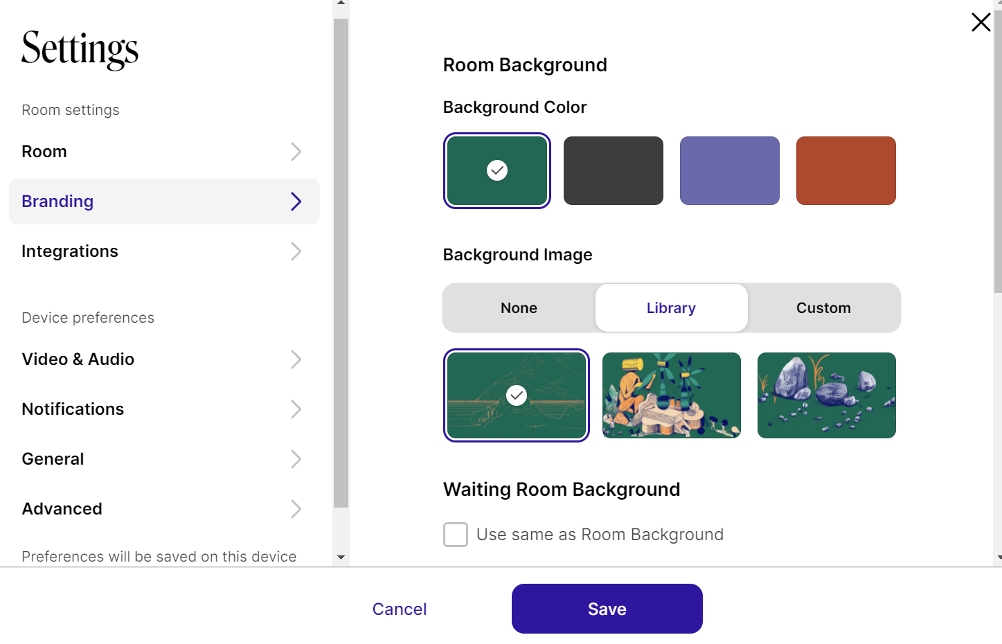 From there you can choose a color or background image for your Room and your Waiting Room. Pro users can upload custom images and logos to match your company's brand.