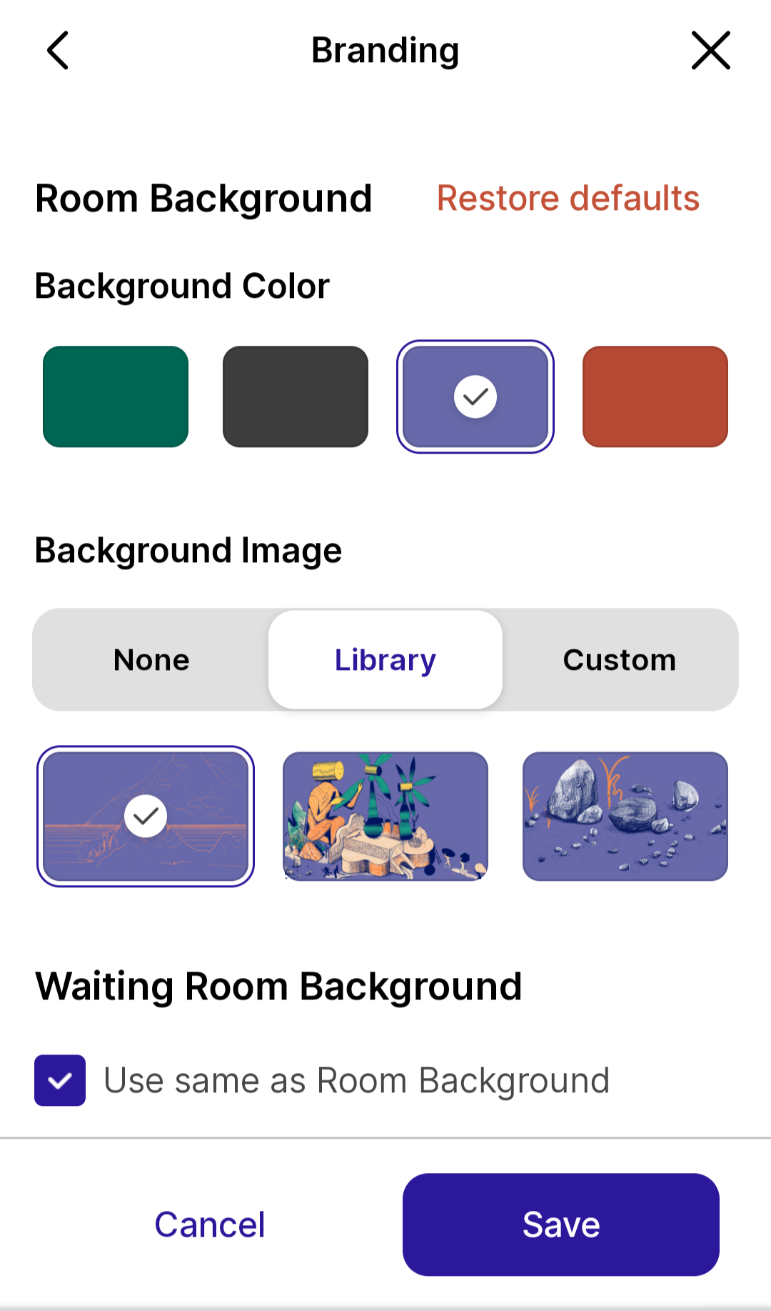 From there, you can choose a color or background image for both your Room and your Waiting Room. Pro Users can upload custom images and logos to match your company's brand.